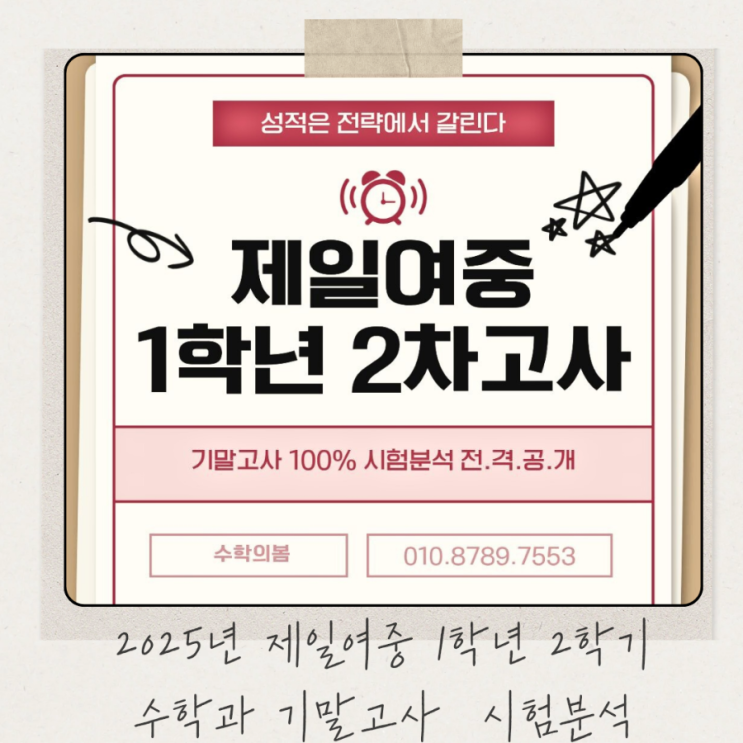 2025년 제일여중 1학년 2학기 수학과 기말고사 시험분석 안녕하세요 마산수학 수봄쌤입니다. 2025년 마무리 잘하셨나요? 2025년이 이제 3주도 남지 않았네요. 오ㄴ 2025년 제일여중 1학년 2학기 수학과 2차고사인 기말고사 분석을 해보려합니다. 출제유형은 어떠했는지 알아볼께요. 제일여중 1학년 2학기 기말고사 수학 시험범위 II. 평면도형 01. 다각형 02. 원과 부채꼴 III. 입체도형 01. 다면체와 회전체 02. 입체도형의 겉넓이와 부피 IV. 통계 01. 자료의 정리와 해석 02. 상대도수 제일여중 1학년 2학기 수학 기말고사 시험분석 제일여중 시험날짜는 12월 3일 (수) ~ 12월 5일 (금) 3일간 진행되었고 수학시험은 12월 4일 목요일 1교시였....... <img src="https://blogthumb.pstatic.net/MjAyNTEyMTJfMjUx/MDAxNzY1NTI3ODkyMDQx.nTiT918PluNMCjDnF-0s35MjOcKeN2NfWz1LPM6LvNwg.PdmNDSVBgdYYr10VgAc3vCGoCfxbYpD5KDkcGx-dNh0g.PNG/900%A3%DF%BA%A3%C0%CC%C1%F6_%BD%C9%C7%C3%C7%D1_%C8%DE%B0%A1_%BE%C8%B3%BB_%B0%F8%C1%F6_%C0%CE%BD%BA%C5%B8%B1%D7%B7%A5_%C7%C7%B5%E5%A3%DF20251212%A3%DF172314%A3%DF0000.png?type=s3" />