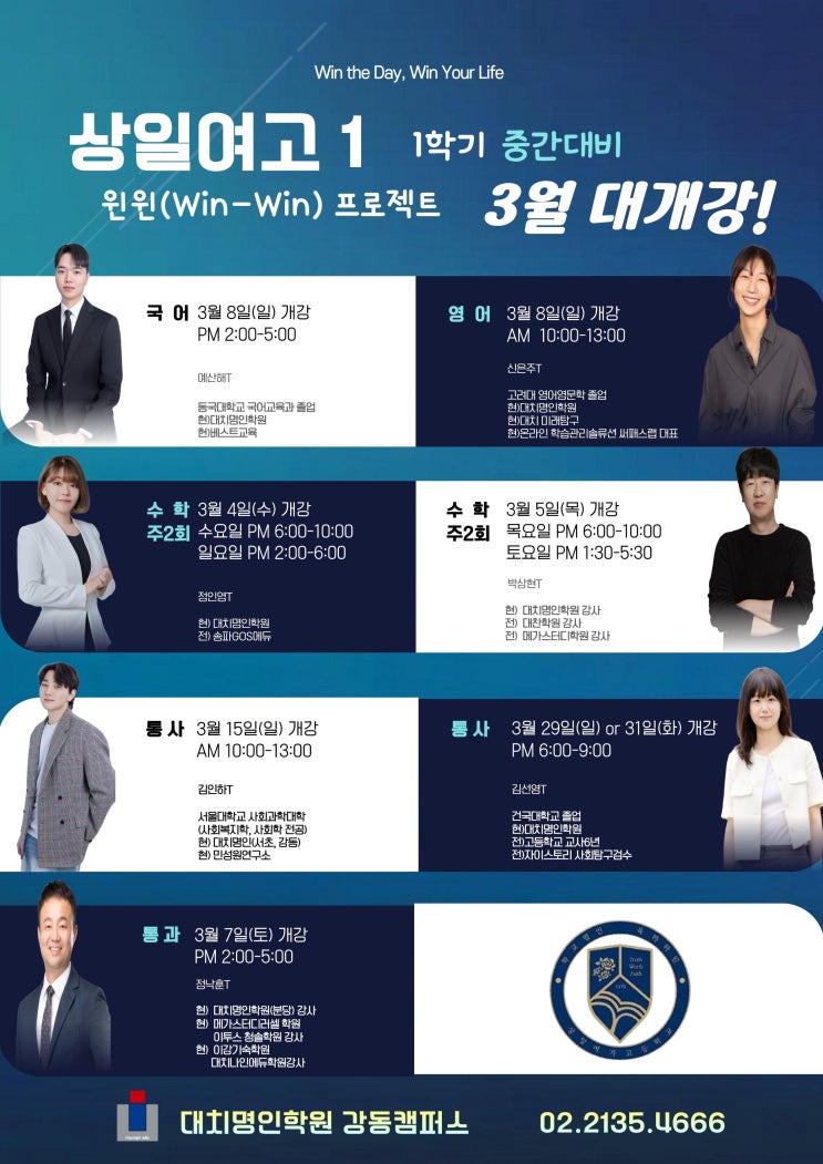 상일여고1 1학기 중간고사 대비 [윈윈(Win-Win) 프로젝트] 처음 마주하는 1학기 중간고사, 혼자 버티지 말자 상일여고1를 위한 원원(Win-Win) 프로젝트 대개강! 국어부터 통합과학까지 전담 강사진 완벽 라인업 성적은 올리고⏫ 부담은 줄이는⏬ 진짜 윈윈 수업 시작합니다✨ ☎ 대치명인강동 상담문의 02-2135-4666 /문자(010-4543-4693)도 가능 ▶상일여고 1학년 중간고사 시간표 : https://vo.la/32yI4Ey #상일여고1 #중간대비 #윈윈프로젝트 #강사진맛집 #내신관리 #강동구학원 #중간고사준비 #상일여고 #1학기중간고사대비 #강동구국어학원 #명일동수학학원 #고덕역수학학원 #대치명인학원 #강동캠퍼스 #내신관리 #고등내....... <img src="https://blogthumb.pstatic.net/MjAyNjAyMTlfNDgg/MDAxNzcxNDkxNDIyODAz.FfcAWQi5Uduqxs0-y3KTxjn7sNJZbXyLecHkXrz4ONkg.4r2Pj_v5bApZicHQqxmlAFxgB78SLMJNRc_oMIysDAIg.JPEG/%BB%F3%C0%CF%BF%A9%B0%ED%B3%BB%BD%C52%C2%F7-_%C1%F7%C5%F5%BF%EB.jpg?type=s3" />