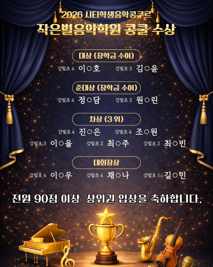 바르고 정확하게! 즐겁고 신나게! 안녕하세요 작은별음악학원입니다 :) 지난 1월 초에 있었던 콩쿨에서 우리 아이들이 믿기 힘든 놀라운 성과를 거두고 돌아왔습니다! 이번 대회는 흔히 말하는 ‘점수 퍼주기식’ 대회가 아니라, 심사가 엄격하고 청렴하기로 유명한 곳이었기에 이번 결과가 더욱 값지게 느껴집니다. 특히 시티음악콩쿠르는 실제 많은 전공 유망주들이 거쳐 가는 대회로, 공신력이 높기로 정평이 나 있습니다. 이런 수준 높은 무대에서 우리 아이들이 당당히 실력을 인정받았다는 사실이 원장으로서 참으로 뿌듯합니다.❤️ 대상 (장학금 수여) 이○호, 김○윤 준대상 (장학금 수여) 정○담, 원○린 차....... <img src="https://blogthumb.pstatic.net/MjAyNjAyMTlfNjAg/MDAxNzcxNTA3MTM2OTM5.2J40n-x-LrfTRyxv0Z15GBmhbMrMjrlT0xqPI4MMO0Ag.0IaBtPmHWe_1icprO6LVyhRj6F8HgOfFi2_5UOY2YMog.JPEG/%C1%A6%B8%F1%C0%BB_%C0%D4%B7%C2%C7%D8%C1%D6%BC%BC%BF%E4.-_%BA%B9%BB%E7%BA%BB_%281%29-.jpg?type=s3" />