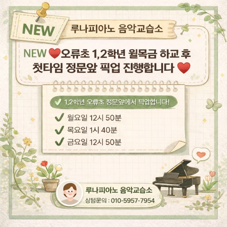 수업 집중도와 원활한 운영을 위해 1, 2학년의 빠른 하교 요일에 한해 픽업을 진행합니다 (방학 기간에는 운영하지 않습니다.) ✔️ 방과후 수업 없이 하교 후 바로 ✔️ 주2~3회반으로 신청가능합니다 ❣️ 픽업 후 바로 수업 ❣️ 현재 1,2학년 신입생 모집중이라 더욱 세밀한 수업 가능하세요~~ 많이많이 신청해주세요!!^^ #오류초등학교피아노학원 #오류초피아노 #오류초피아노학원 #오류동피아노학원 #오류초등학교피아노 <img src="https://blogthumb.pstatic.net/MjAyNjAyMjdfMSAg/MDAxNzcyMTk5NjAzODgz.Aeeb6GS15KCY1ZJZFEqmH4RqHewAG7W4NevxqIHXOtUg.qTaTkgLRTXvk8G1JDzy6JQVgGAo8m3T8M9IDTdsThOwg.JPEG/6123CBC2%A3%AD70F1%A3%AD46EF%A3%AD8F52%A3%AD02153E037016.jpg?type=s3" />