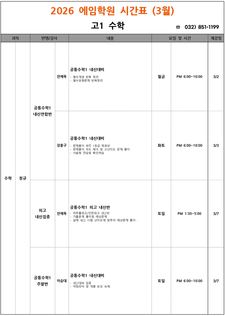 에임학원 2026 3월 시간표
