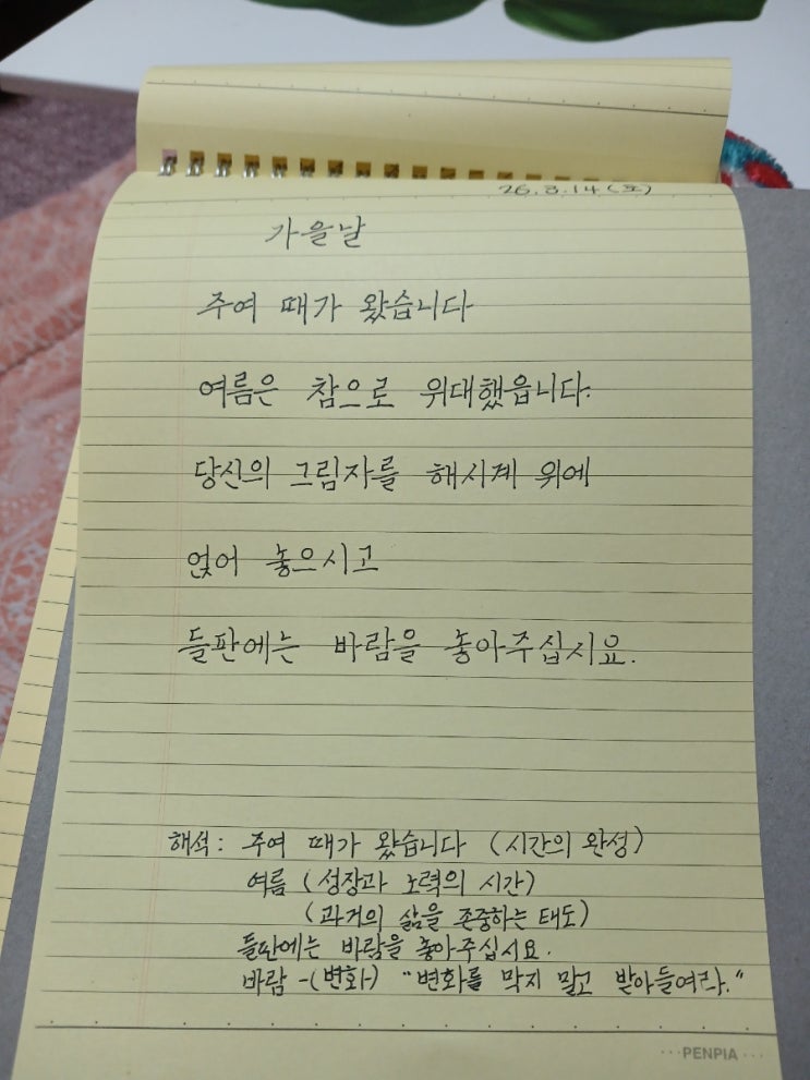 이 시는 이렇게 말해 주는 것 같습니다. 사람은 살면서 힘든 일도 겪고 열심히 노력하며 살아갑니다. 그 시간을 지나면서 사람은 조금씩 더 단단해지고 깊어집니다. 그래서 힘든 시간도 우리에게 의미 있는 시간이 될 수 있습니다. “오늘도 한 문장을 천천히 따라 쓰며 마음의 속도를 조금 늦춰 봅니다.” <img src="https://blogthumb.pstatic.net/MjAyNjAzMTVfMjUz/MDAxNzczNTI1MjU0ODgy.Lrb9CEwll4dzu72O2pTkbocdQsbCNEoSJ1nDWfbB8Egg.ggpQJqAkutEAwofTDKrBJ4GLkem8hV2diK9FTvcxP54g.JPEG/900%A3%DF20260314%A3%DF073659.jpg?type=s3" />