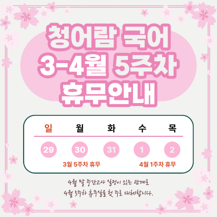 안녕하세요~ 청어람국어학원입니다:) 어느덧 날이 풀리고 있네요~✿ 모두들 새학기 기대하고 계신가요? 청어람국어 3월 수업 일정 안내입니다. 3월 5주차인 3월 29-31일과 4월 1주차인 4월 1-2일은 학원 휴무입니다. 4월 말은 중간고사가 진행되기 때문에 불가피하게 5주차가 아닌 1주차에 쉬게 되었습니다. 4월 3일 금요일은 정상 수업 하오니, 일정 미리 참고하시어 착오 없으시길 바랍니다. 내신대비 또한 학원 휴무일에는 진행하지 않으니, 착오 없으시길 바랍니다. 휴무 기간 동안에는 연락이 어렵습니다. 010.6667.8239로 이름/학교/학년/문의사항 문자로 남겨주시면 확인 후 연락드리겠습니다. <img src="https://blogthumb.pstatic.net/MjAyNjAzMDFfMjQ3/MDAxNzcyMzU1MzkyMDE1.Zy94s7Al5OEhYhCr3M0wNASjix65px-HocwB_YPXzSsg.udhEuTrhxguVZXY8vb2U81s6-4fFDxZjzpxXcc1iqXQg.PNG/3%2C4%BF%F9_%B1%B9%BE%EE_%C8%DE%B9%AB.png?type=s3" />