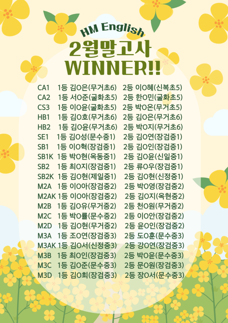 HM잉글리쉬 2월말고사 WINNER 발표 #무거동영어학원 #옥동영어학원 #장검영어학원