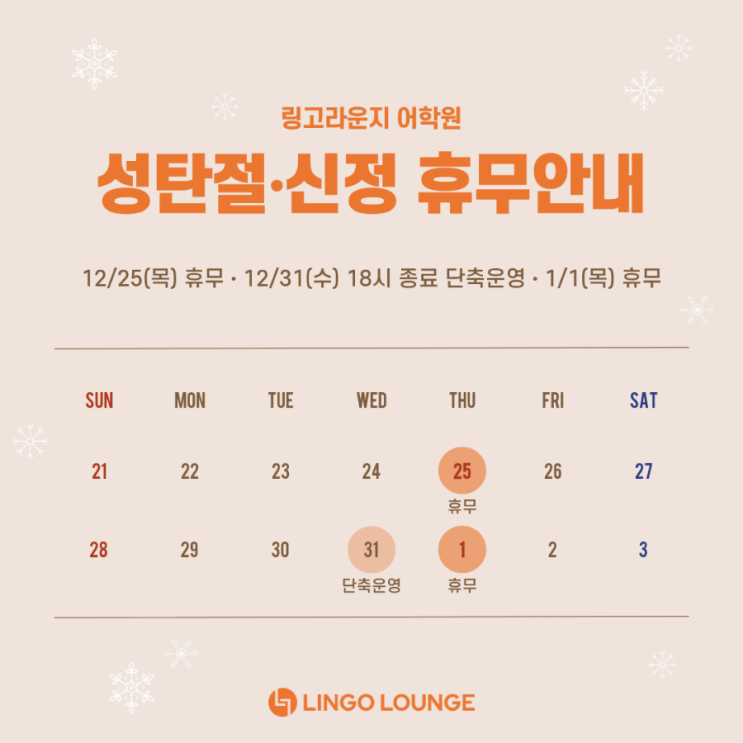 성인 일대일 외국어 회화 전문 링고라운지 어학원입니다. 다가오는 성탄절과 신정 휴무 아래와 같이 안내 드립니다. 12/25(목) 휴무 12/31(수) 18시 종료 단축운영 1/1(목) 휴무 휴무일에는 상담과 수업 모두 쉬어가며, 12/31 단축운영일에는 10-18시 운영되는 점 참고 부탁드립니다! 이외에는 월-금 10-22시, 토 9-16시, 일 휴무와 같이 정상 스케줄로 운영되며 휴무일에 상담 문의주시는 분들께는 정상운영일에 순차적으로 회신 드릴 예정입니다. 링고라운지 어학원을 찾아주는 모든 분들 행복한 연말연시 보내시길 바랍니다 ✨ 링고라운지 어학원의 모든 수업은 전국에서 화상(비대면)으로 수강이 가능합니다! <img src="https://blogthumb.pstatic.net/MjAyNTEyMTVfMjAw/MDAxNzY1Nzg1MTI0ODg1.lVQfawW6mOtl8RmXha6Yg-2av4iLzyC42a30RnLCy4Qg.l8DvMXEpU0cGiDlx4x3YrXfo9JAFT_6sdQMqpGyJuYMg.PNG/900%A3%DF1765784997036.png?type=s3" />