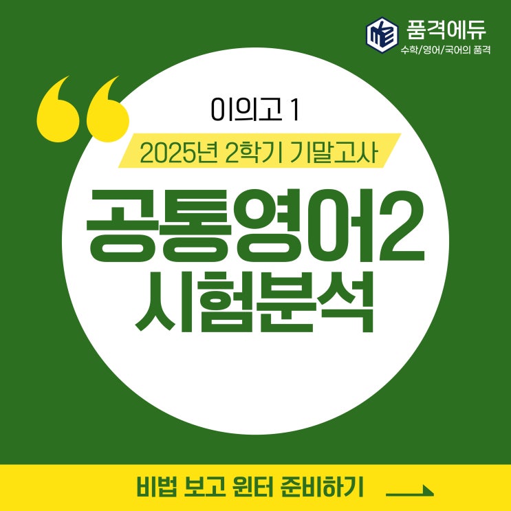 안녕하세요! 광교 중고등 영어학원 품격에듀, 영어의품격학원입니다. 2025년12월18일 시행된 이의고등학교 1학년 2학기 중간고사 영어 공통영어2 시험분석과 겨울방학 공부 전략까지 알아보려합니다. <출제현황> <출제 범위> 공통영어2 능률(민) 4과 EBS 수능특강라이트 영어 23강 2024년 고1 10월 모의고사 21,22,23,24,31,32,33,34,36,37,38,40 2025년 고1 10월 모의고사 21,24, 29, 33, 34, 37, 39 <난이도 분석> 중상 (하 5문항 / 중하 5문항 / 중 9문항 / 중상 2문항 / 상 5문항) <시험 총평> <겨울방학 공부 전략> 1.어휘는 ‘양’보다 ‘반복 정확도’ 시험에 자주 나오는 핵심어휘를 여러 번 반복하는하며....... <img src="https://blogthumb.pstatic.net/MjAyNTEyMTlfMTY5/MDAxNzY2MTQxNzM2OTI4.bRl81jBwfe-fJ0XIzFKrvW2ZGrwTrCfKSLWCEsrsNnIg.V0KjsxHKcAkVmstsNs3ME57-C8vW3EK91K4NzJaVb-Yg.JPEG/001.jpg?type=s3" />