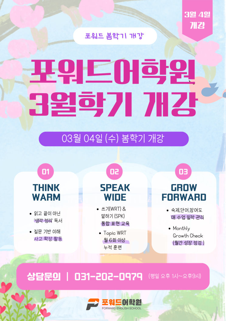 안녕하세요, 포워드어학원입니다. 새 학년, 교재만 바뀌어서는 실력이 달라지지 않습니다. 이제는 ‘공부 방식’이 달라져야 합니다. 포워드는 이렇게 준비합니다 THINK WARM 문해력 기반 Reading 많이 읽는 영어가 아니라 이해하고 생각이 남는 독서 ✔ 매달 다권 정독 + 질문 중심 이해 활동 ✔ 읽고 → 정리하고 → 자신의 언어로 연결 ✔ 문해력과 사고력을 함께 성장 SPEAK WIDE Writing & Presentation 아는 영어를 말하고 쓰는 영어로 바꾸는 과정 ✔ Writing(WRT) + Speaking(SPK) 통합 훈련 ✔ 월 6회 이상 누적 아웃풋 트레이닝 ✔ 논리 표현력 + 자신감 동시 성장 GROW FORWARD System + Care 관....... <img src="https://blogthumb.pstatic.net/MjAyNjAyMjdfMjUg/MDAxNzcyMTg2Mjk4MzU2.3S635i9IglHKQpuHyp1Ebdzkbfx1Mrmf7u8ojXDhqoMg.2kkf3DeqyqYI_XwO1KOEbqRvB1d9WYjNOGZJdNlDy5sg.PNG/3%BF%F9_%B0%B3%B0%AD_-_SNS%BF%EB.png?type=s3" />