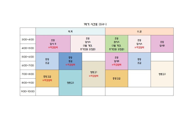 3월 9일에 확정시간표가 나옵니다. 1학년은 영덕고,수원고,태장고,매원고 반이 운영중이며 2학년 영덕고,수원고,태장고 반이 개설될 예정입니다. 미리 연락주시면 시간표 수정이 가능하오니 문의 주시길 바랍니다. 감사합니다.