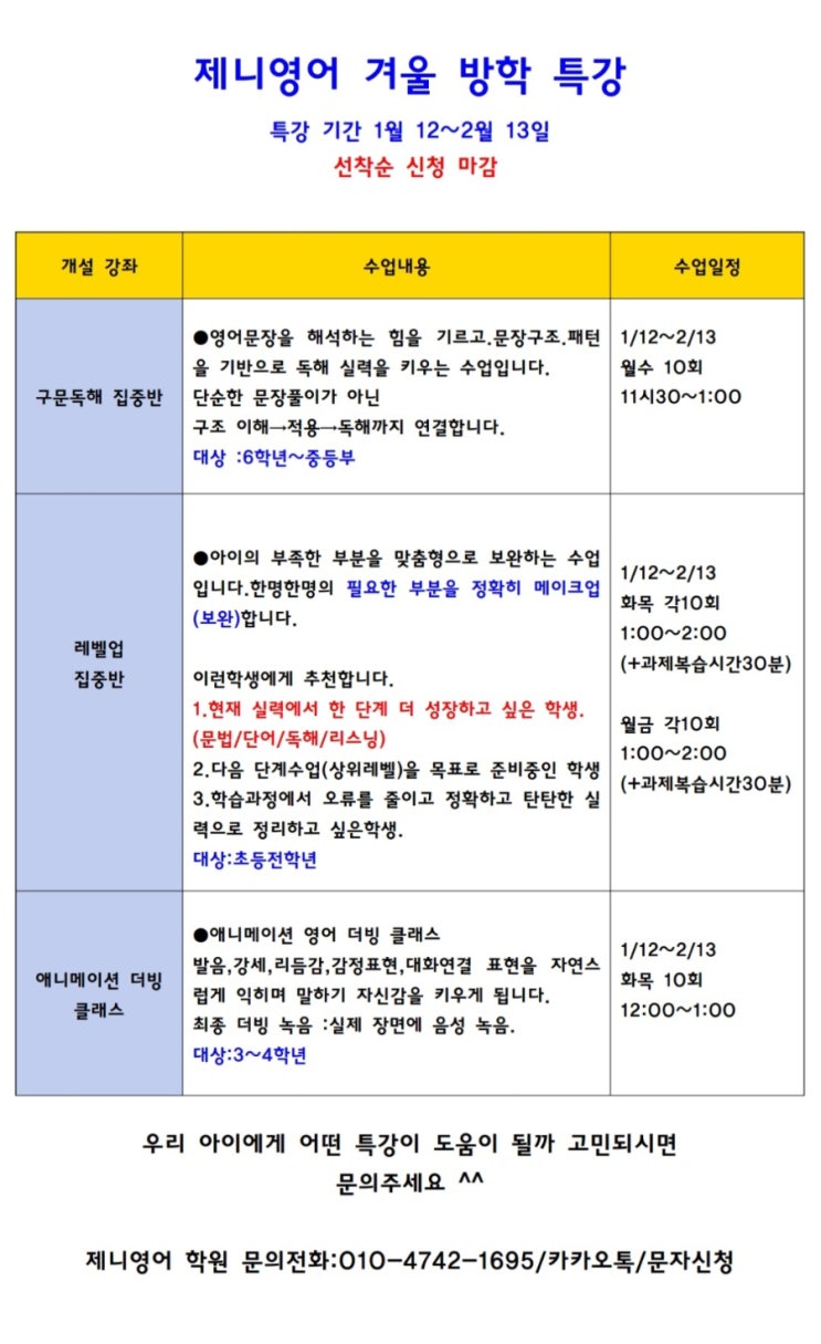 재원생 대상 · 현재 거의 마감! 이번 방학에도 제니영어 학생들이 차근차근 실력을 쌓아갈 수 있도록 방학특강을 준비했습니다. 수준별 맞춤 수업과 밀착 관리로 아이들이 놓치기 쉬운 약점을 보완하고 새 학기를 더 가볍게 시작할 수 있도록 구성했어요. 현재 재원생 신청이 거의 마감되어 남아 있는 자리가 많지 않습니다. 필요하신 분들은 빠르게 문의 주세요. 이번 방학, 제니영어와 함께 확실한 성장 한 번 만들어 볼게요! ✨ 우리 귀염둥이 파닉스반들을 위한 영어로 진행하는 원데이 쿠킹클래스도 준비중입니다.기대해주세요~~^^ <img src="https://blogthumb.pstatic.net/MjAyNTEyMTJfMjMw/MDAxNzY1NDcyNDk2MTk4.eVCe5Ut-Y3MIFUPBb61UBAcrJaq_oUHX13t-y5H33Ekg.8J9HjVUXhaLGDdfXXfaYpmJtJs4m8WFRSiRS8WtNIFUg.JPEG/900%A3%DFScreenshot%A3%DF20251211%A3%DF122004%A3%DFOneDrive.jpg?type=s3" />