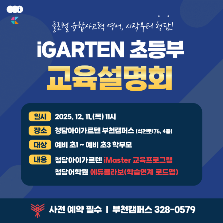 안녕하세요. 청담아이가르텐 부천중동캠퍼스입니다. 글로벌 융합사고력 영어, 시작부터 청담! < 2026학년도 초등부 교육설명회 >가 다음과 같이 진행됩니다. 참석을 희망 하시는 분께서는 사전 예약 신청해주세요! ○일시: 2025년 12월 11일(목) 11시 ○대상: 예비 초1~ 예비 초3 자녀를 둔 학부모님 ○장소: iGARTEN부천 강당 (부천시 원미구 석천로176, 이원빌딩 4층) ○참석신청서(필수)↘↘↘ https://forms.gle/RTu1SYJopKXVjQ5V9 ** 사전예약필수이며, 유아동반 참석은 불가합니다. ** 주차장이 협소하니 가급적 대중교통 이용 부탁드립니다. ** 문의 시 원으로 연락부탁드립니다. <img src="https://blogthumb.pstatic.net/MjAyNTExMTRfMjUz/MDAxNzYzMDk4Njc2MTkx.kxZchPyux4mO18MWgmj7kY6oDPf37XNJqnfVAnMcoKYg.SLNfjeSZj8yMjzHOjN7gy74oXzsOxeN9xrwF50S3h-4g.PNG/%C1%A6%B8%F1%C0%BB_%C0%D4%B7%C2%C7%D8%C1%D6%BC%BC%BF%E4_%287%29.png?type=s3" />