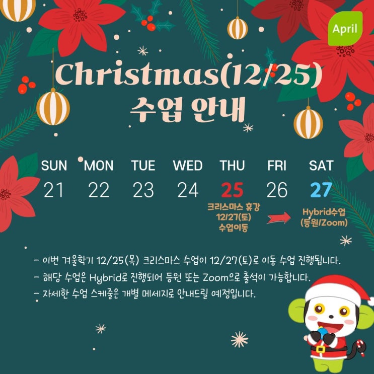 [April어학원 부천상동캠퍼스]크리스마스 이동 수업 안내드립니다
