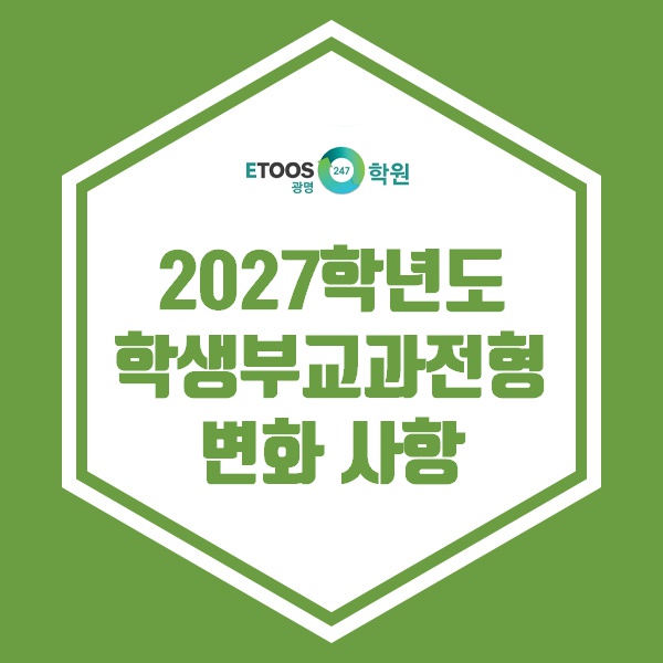안녕하세요 ! 이투스247광명점입니다 오늘은 2027학년도 학생부교과전형 변화 사항 함께 살펴보려합니다! 해당 포스팅 출처는 이투스 교육평가연구소 입니다! 서울·수도권 주요 대학 변화 총정리! 2027학년도 학생부교과전형에서 교과 반영 방식부터 수능최저학력기준까지 굵직한 변화가 예고되었습니다. 2027학년도 학생부교과전형 주요 변화 ✔ 교과 반영 과목 구성 변화 ✔ 진로선택과목 적용 확대 ✔ 수능최저학력기준 완화 ✔ 정성평가 및 서류평가 요소 확대 2027학년도 수시 전략 핵심 포인트 ✔ 진로선택과목 반영 방식 확인 ✔ 수능최저 완화 대학 적극 검토 ✔ 정성·서류 평가 확대 대학 대비 ✔ 탐구 과목 조합 전략 재설계....... <img src="https://blogthumb.pstatic.net/MjAyNjAyMjhfMTk5/MDAxNzcyMjYzMjc2MzUw.OhJIyG2vtw9I3LUfi11pEQZT2RTxic17Bk_ZG215nW8g.ZOFnPsi_uGY4UrmqijhYRd-xUNAfSA01kcwzumbBcgAg.JPEG/%C0%B0%B0%A2%C7%FC_%BE%E7%BD%C4%28%C3%CA%B7%CF%29.jpg?type=s3" />