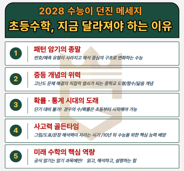 안녕하세요. 명이풀입니다. 2026학년도 수능 결과가 발표되면서, 많은 학부모님들께서 "우리 아이는 아직 초등생이긴 한데, 지금부터 수학을 어떻게 준비해야 하나요?"하고 궁금해하십니다. 초등수학, 중고등수학의 근간이 되는 너무나도 중요한 초등수학이 단순히 연산을 우선시하는 쉬운수학으로 여겨서는 안됩니다. 더군다나 달라지는 입시에서 초등수학은, 지금부터 달라져야 합니다. 1. "패턴 암기형 수학"이 더 이상 통하지 않습니다. 사실 수능시험에서는 패턴 문제가 존재했습니다. '수능 개념'이라 '수능 유형' 이라는 말도 있듯이 말입니다. 무항 번호에 따라, 단원에 따라 정해진 유형....... <img src="https://blogthumb.pstatic.net/MjAyNTEyMDlfMjkz/MDAxNzY1MjQyNzAwNTgw.YD3YNg05CFKSLad3ScYJ0B9SguCHiBHXI0LlLz8owgog.s72yAjgGl68xSEdZIr98fyfeixBV_rqXLj1l0KDPnWQg.PNG/Cap_2025-12-09_10-11-04.png?type=s3" />