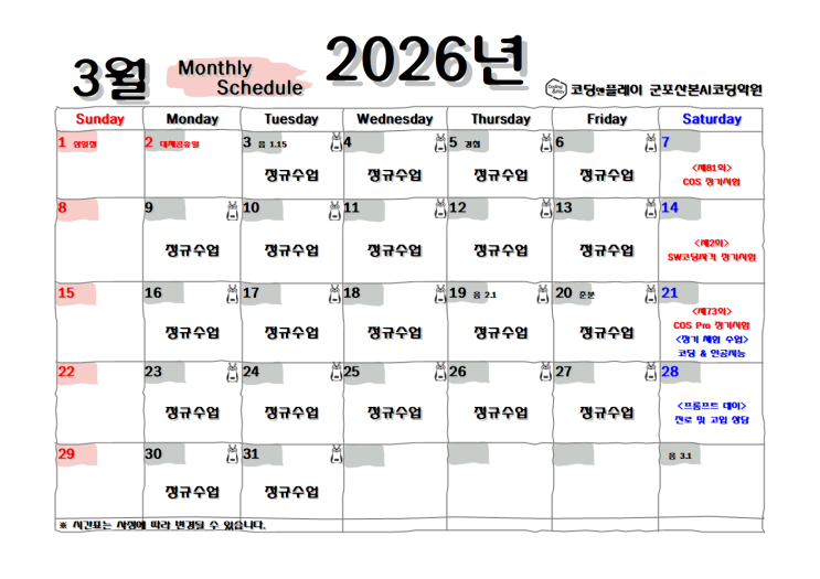 [코딩앤플레이 군포산본AI코딩학원(Coding & Play Gunpo)] 2026년 3월 학사일정