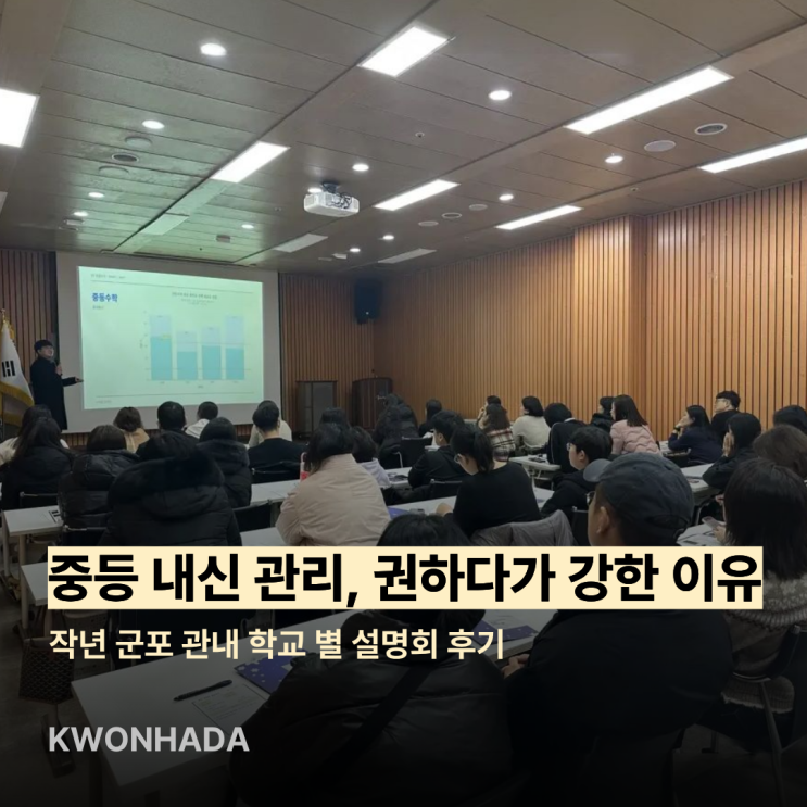 안녕하세요! 권하다 중등관입니다. 저희 권하다에서 진행하는 국어, 영어, 수학, 과학 전과목 <중간고사 내신대비 설명회> 참석을 고민하고 계신가요? <권하다 설명회>는 특별합니다. 군포 산본 지역을 사랑하는 마음으로 진짜 군포 지역 입결을 응원하는 마음을 담아 "전과목 선생님들을 한 자리에 모셨습니다." 국어, 수학, 영어, 과학 각 과목의 담당 선생님이 직접 발표합니다. 그리고 원장님께서 지금 중학생 학부모님이 꼭 알아야 할 입시 정보를 '초급 레벨'로 정리해 드립니다. [권하다] 중등 설명회 참여신청 https://naver.me/GjyMRPiW 1부: 중간고사 대비 전략 ■ 담당 선생님들이 직접 발표하는 과....... <img src="https://blogthumb.pstatic.net/MjAyNjAzMDNfMjg4/MDAxNzcyNTIwODUzMjEx.kYPVXDAuJUgr6Gl8u7LgZofoCFf6bPNJ-IgeXEixUxYg.YfmgFIMYt_CkN6S_mq2NYOYQN4V2aiHcDEJfalHjE5Mg.PNG/3%BF%F9_%BA%ED%B7%CE%B1%D7_%BD%E6%B3%D7%C0%CF.png?type=s3" />