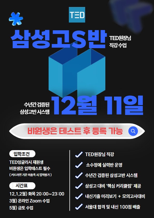 12월 11일, TED 삼성고 S반 드디어 개강! TED 삼성고 S반은 왜 특별할까요? ✔ TED 원장님 직강 다년간 삼성고 대비를 연구해온 원장님이 직접 강의합니다. 핵심만 뽑아 전달하는 압축·정확한 강의가 강점입니다. ✔ 소수정예 실력반 운영 학생 한 명 한 명의 수준과 학습 태도를 세밀하게 관리합니다. 개별 피드백은 물론, 약점 보완 프로그램까지! ✔ 수년간 검증된 삼성고반 시스템 삼성고 출제 경향 분석 → 내신 대비 → 모의고사 대비까지 전 과정을 체계적으로 설계한 TED만의 시스템입니다. ✔ 핵심 커리큘럼 + 내신기출 미리보기 삼성고 내신의 특징을 반영한 문제풀이와 기출 분석으로 실전과 같은 대비가 가능합니다. ✔ 서울대....... <img src="https://blogthumb.pstatic.net/MjAyNTEyMDlfMTk0/MDAxNzY1Mjc1Mzk0MTU5.oLe4k5Jc1_5SodJSJu5nGTM9lZC09_M16cglCTPGixsg.ViM8E2rBbJbKLD-p1QhA0pfAAuQaPWwqBErScsmAAC8g.JPEG/%BB%EF%BC%BA%B0%ED_%B0%B3%B0%AD_%BE%C8%B3%BB.jpg?type=s3" />