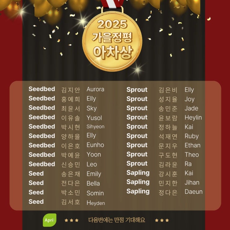 2025 가을학기 정기평가 만점 - 에이프릴어학원 천안불당캠퍼스
