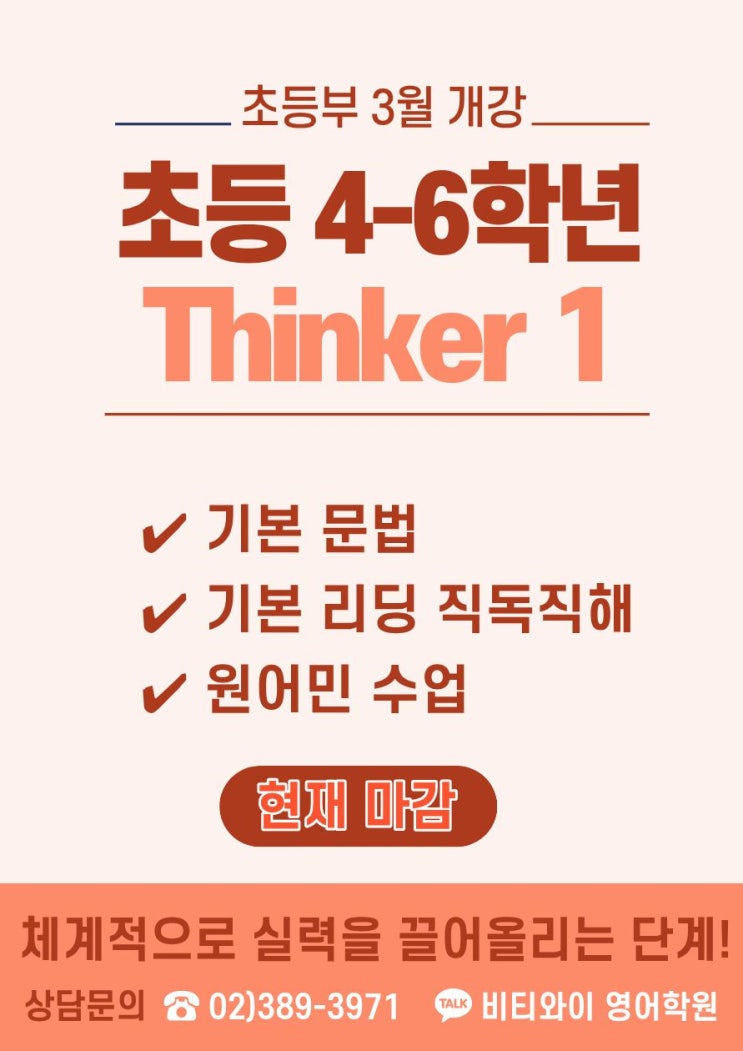 [비티와이 영어학원] 3월 개강 초등부 4-6학년 Thinker 1반 모집 안내 (마감)