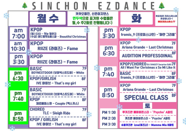 2025년 12월 넷째주 수업곡명 #크리스마스 #메들리 #케이팝 안무 배우기 안녕하세요 #랭키닷컴 1위 #댄스학원 #신촌이지댄스 입니다! 이제 ! 드디어 ! 2025년의 크리스마스가 다가오고 있는데요! 이번 25년 12월 넷째주의 수업 곡명도 크리스마스 분위기 낭낭한 곡들로 준비되어있습니다! 바로바로 크리스마스 곡들 중 리메이크 되어 많이 나오고 있는 노래 중 하나인 #화이트 #WHITE 를 #보이넥스트도어 #boynextdoor 버전으로?! 또 #젝스키스 의 #커플 을 #제로베이스원 버전으로 배워보실 수 있답니다! 우와아-- 이 외에도 #alliwantforchristmas 의 리믹스 버전 안무와 #arianagrande 의 #lastchristmas 까지! 이 외에도 #라이즈 #riize #아....... <img src="https://blogthumb.pstatic.net/MjAyNTEyMjBfMjQ1/MDAxNzY2MjEwMTU2NzU3.bvDQ59BtsQ8dKANserqRVPyL-tnNx7gfkkBPuaKzhL4g.T5ojnSlj4FerSPUvIXVgDeFHMP4CRV6vDUAPIHLFKzEg.JPEG/12%BF%F9-%B3%DD%C2%B0%C1%D6-%BC%F6%BE%F7%B0%EE%B8%ED.jpg?type=s3" />