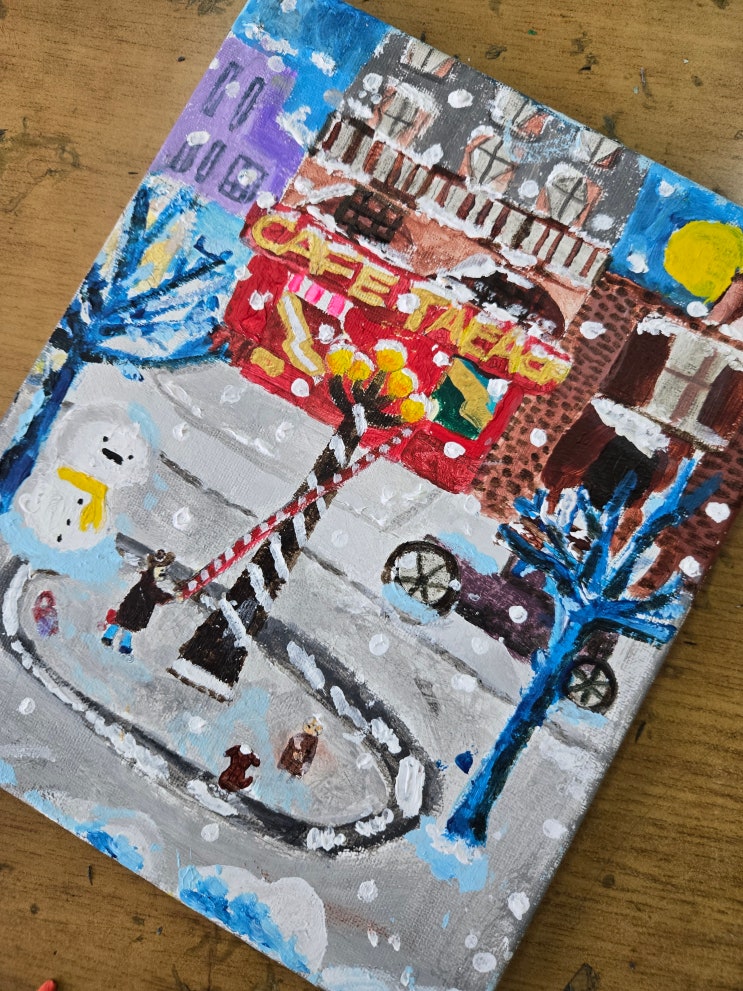 군산미술학원 캔버스 아크릴화 수업 소룡동 화가손미술학원의 겨울풍경그리기 안녕하세요 군산 소룡동에 위치한 화가손미술학원입니다 오늘은 군산미술학원 수업시간에 진행한 캔버스 아크릴 겨울풍경 그리기 수업을 소개해드릴께요 화가손미술학원에서는 캔버스에 아크릴 물감을 사용해 계절감이 느껴지는 겨울풍경을 표현해보았습니다 산북초등학교 2학년 나예작품 다이소와 붕어빵가게가 보여요 소룡초등학교 3학년 민제의 작품 이렇게 완성 서산 대진초등학교 4학년 누리의 작품 미성초등학교 4학년 혜림이의 작품 이렇게 변신중 군산미술학원 아크릴화수업의 특징은 이번수업 *캔버스사용 *아크릴 물감의 레이어 표현 *원근감 이해 *색대비....... <img src="https://blogthumb.pstatic.net/MjAyNjAyMjZfNjMg/MDAxNzcyMDQzMjU3MTcy.moxqaCziuKE0jvKM158iKJTaQAkkBN0zfjH0Ii9VslMg.keKnL8nGTxXV3vwINBQRygNCqc2-hn_YE0uPZtwZKZAg.JPEG/20260204_161806.jpg?type=s3" />
