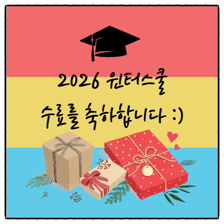 안녕하세요 이투스 247 마포학원입니다. 오늘은 2026년 윈터스쿨 종강일입니다. 쉼 없이 달려온 두 달 간의 겨울방학이 마침표를 찍고, 설레는 새학기가 시작됩니다. 길다면 길고 짧다면 짧은 시간이었지만 많은 것을 배우고 느끼고 경험한 시간이었을거라 생각합니다. 오늘은 2026년 윈터스쿨 종강을 맞아 졸업선물 증정식 사진을 담아보았습니다. 어떤 모습인지 궁금하시죠? 저를 따라오세요 :) 졸업선물 구성품은 나빙 텀블러 초콜렛 선물세트 양말 준비 했습니다. 형형색색 텀블러 색깔이 다양해서 너무 예쁘네요 *^^* 포기하지 않았던 그 마음이 성공의 씨앗이다 건강하게 끝까지 가자! 파이팅!!! 윈터스쿨 수료를 축하해~ 두 달간의 여정을....... <img src="https://blogthumb.pstatic.net/MjAyNjAyMjZfMTc3/MDAxNzcyMDY1MDY5ODYw.E9hcQorVuTVMgOmK3LFrMhoE77olKEVQ8CY3ugZx8agg.Yl5Iy3dAUy6ZnI9KDVsy1Zup_YulI3i_Z36QnExHlC4g.PNG/image.png?type=s3" />