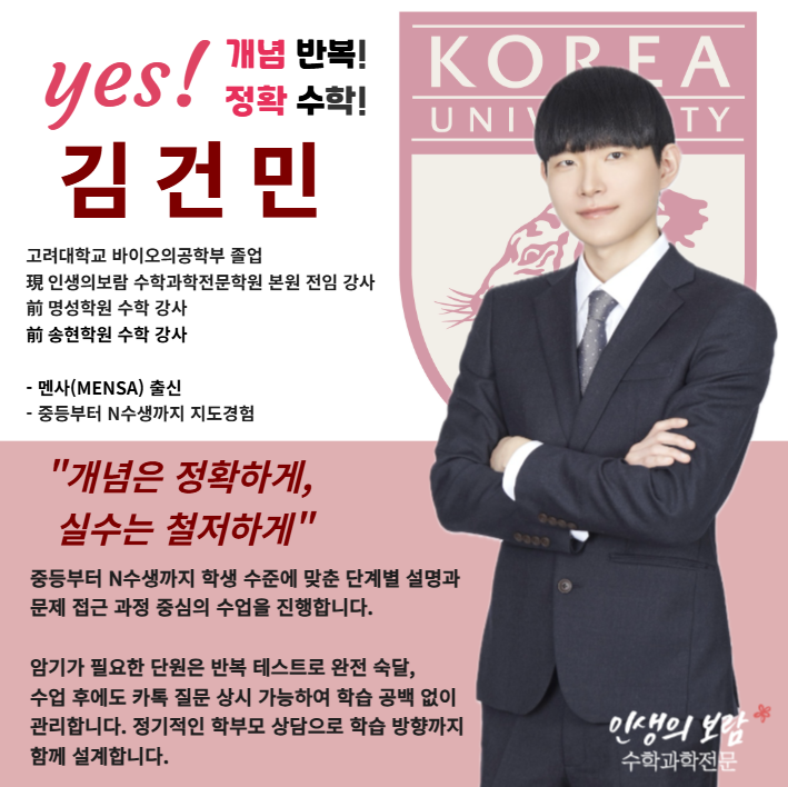 안녕하세요 인생의보람 수학과학 전문학원 본원입니다. 오늘은 이번에 새로 오신 멘사(MENSA) 출신으로 중등부터 N수생까지 폭넓은 지도 경험을 갖춘 김건민 선생님을 소개해드립니다! 김건민 선생님의 수업은 '정답을 맞히는 수업’이 아니라 문제에 접근하는 사고 과정을 기르는 수업입니다. 문제를 무작정 풀게 하지 않고, 접근 과정을 STEP별로 나누어 설명하며 학생이 스스로 이해하고 적용할 수 있도록 지도해요! 하나의 문제도 다양한 풀이 방법을 통해 접근하여 사고의 폭을 넓히는 것이 특징이죠. 수업 이후까지 이어지는 철저한 학습 관리 수업이 끝난 후에도 메신저를 통해 언제든 질문이 가능하며, 패드를 활용해 풀이 과정을 꼼....... <img src="https://blogthumb.pstatic.net/MjAyNjAyMjZfMjE1/MDAxNzcyMDc1Nzg5NTYx.EV2t8DP8xwaLASCEsVumIWCPhfRNbYHhUCDU1uqqKNcg.Uo2qgrkBlNF8Bg7eTHlFoU9NYrcxpDDw9VSJw7-hBNog.PNG/image.png?type=s3" />
