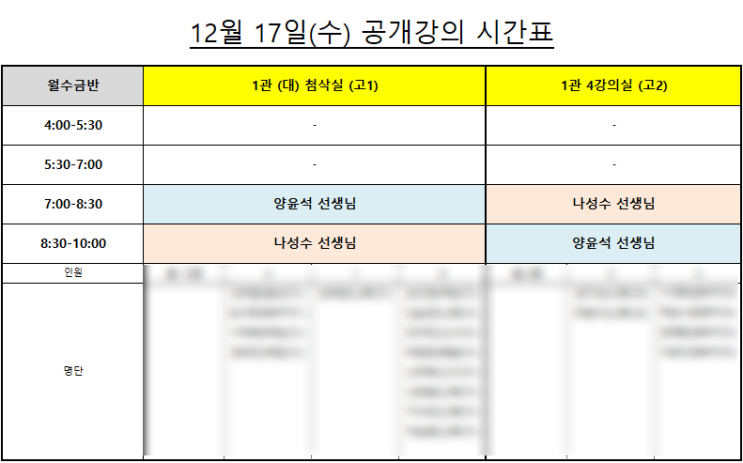 안녕하세요 해라수학입니다 :) 어느덧 올해의 마지막 시험이 2학기 기말고사도 거의 마무리되었습니다. 남은 12월은 학생들아 지나간 한해를 정리하면서 잠시 숨고르기를 하고 더 힘차게 도약하며 내년을 준비할 시간입니다! 해라수학학원에서도 내년도 구상을 위해 예비고2/3 대상 공개강의를 진행하려고 합니다. 시간표는 아래와 같이 진행되니 참고 부탁드립니다. 12월 17일 수요일 공개강의 시간표 12월 18일 공개강의 시간표 공개강의를 통해 학생들도 보다 잘 맞는 수업 방식을 선택할 수 있도록 하고 평소에 직접말로 하지 않았던 강의 피드백이나 요청사항도 받아보고 내년을 위한 정비를 하려고 합니다!! 학생들이 매일매일 더 편하게 공....... <img src="https://blogthumb.pstatic.net/MjAyNTEyMTZfMjUz/MDAxNzY1ODc4Mjc0Njk1.fRXRVnz8_djQCNsiECg81nL45jRXp4grC9D8vSRRkjAg.XMrD82I6XUJQuvKlMFPdmDr9b21V_zBLSaZQVhfp9Zgg.PNG/%B0%F8%B0%AD1.png?type=s3" />
