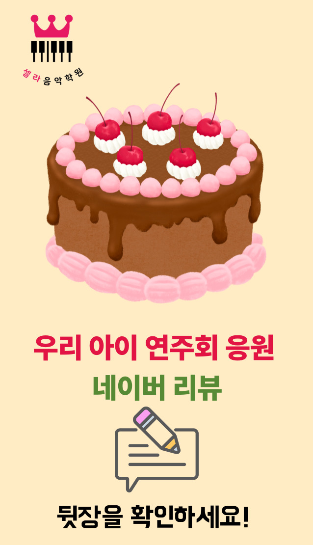 안녕하세요! 셀라 음악학원 입니다 : ) 12월 연주회를 기다리면서 아이들의 연주회를 응원하는 네이버 리뷰 이벤트를 진행합니다! 정성스럽게 리뷰를 써주시면 아이에게 스티커 100개가 주어집니다 연주회에 참여하는 친구들에게 리뷰 티켓을 보내드려요! <img src="https://blogthumb.pstatic.net/MjAyNTExMThfMTM0/MDAxNzYzNDU3MzA4MDUx.e9T-AjZvdCFcQ8ZLLslZgjHgwcgR92zYd4f78nnyaaEg.ZIg4KqbAWtWWAv4whpvfI0p7Y5m6TpkkVNYJLZO7gZ8g.JPEG/KakaoTalk_20251118_181120824_01.jpg?type=s3" />