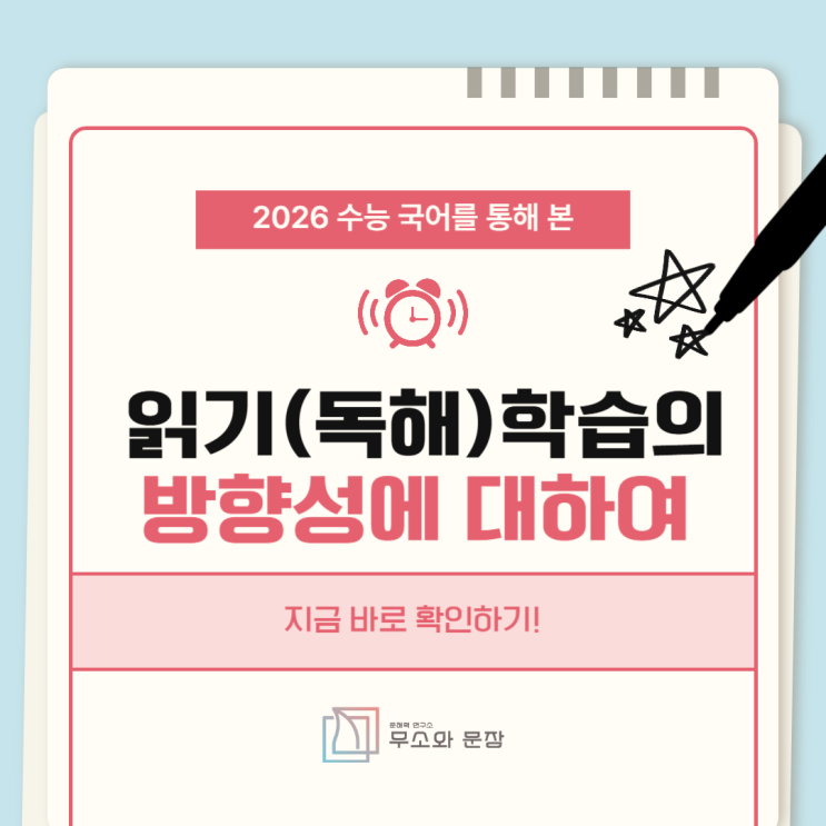 안녕하세요 "언어 영재로 키웁니다" 문해력 연구소! 위례 독서논술학원 무소와 문장입니다. 2026 수능 국어의 출제 기조 분석 2026 수능 국어 영역별 출제 기조는 ‘독서와 문법에서의 변별력’ 그리고 상대적으로 ‘문학은 평이하게’로 보인다. 올해 6월과 9월 두 차례 평가원 모의평가를 치룬 수험생들이라면 기존 평가원의 스탠스가 ‘평이한 독서, 까다로운 문학’이었다는 사실을 기억할 것이다. 이러한 일련의 과정을 경험하며 수능을 대비한 수험생들에게 사실 이번 수능은 소위 ‘뒤통수 맞았다’는 느낌이 들 수도 있을 것이다. 불수능의 근본 원인 : 독서 영역의 구조적 난이도 하지만 우리가 지금껏 출제된 수능 국어를 되....... <img src="https://blogthumb.pstatic.net/MjAyNTEyMDJfMjE0/MDAxNzY0NjQxODMzNTEx.r5NlgHOOPbMMuus-i38t_KIQZv-x8HVu_UxhBHwlHB8g.mE8VRqGmOlT7dJNjDuGQP6OmetGsxCTt7tWTKh5_lDAg.PNG/%C0%A7%B7%CA_%B5%B6%BC%AD%B3%ED%BC%FA%C7%D0%BF%F8_%281%29.png?type=s3" />