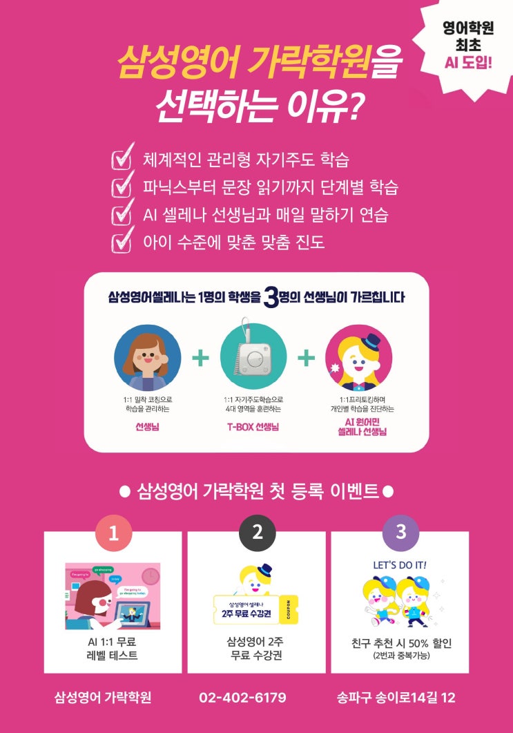 아이 영어학원 어디로 보낼지 고민되신다면, 삼성영어 가락학원 한 번은 꼭 비교해보셔야 해요. 초등·중등 전문 커리큘럼에 AI 원어민 셀레나 시스템까지 갖춘, 송파 가락동 대표 영어학원입니다. 왜 삼성영어 가락학원인가요? 체계적인 관리형 자기주도 학습으로, 아이가 스스로 공부하는 힘을 길러줍니다. 파닉스부터 문장 읽기까지 단계별로 올라가는 커리큘럼이라, 영어가 처음인 아이도 기초를 탄탄히 쌓을 수 있어요. 영어학원 최초 도입 AI 원어민 ‘셀레나 선생님’과 매일 말하기 연습으로, 말하기 감각을 자연스럽게 키워줍니다. 아이 수준에 맞춘 개별 진도로, 잘하는 부분은 빠르게, 부족한 부분은 충분히 반복하며 자신감을 채워줍....... <img src="https://blogthumb.pstatic.net/MjAyNjAyMjZfMzEg/MDAxNzcyMDk2MDI2OTAz.zm0htzp5pEAmTdH28AcPXPGhj_8_eU1myAFY6JR8u5gg.IjeFyXxFV94HuKlBj0s_wwFoo7-fOtScjUKsA6tsCb8g.JPEG/KakaoTalk_20260224_184404139_01.jpg?type=s3" />