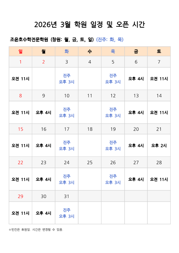 2026년 3월 학원 오픈 및 운영 시간 안내