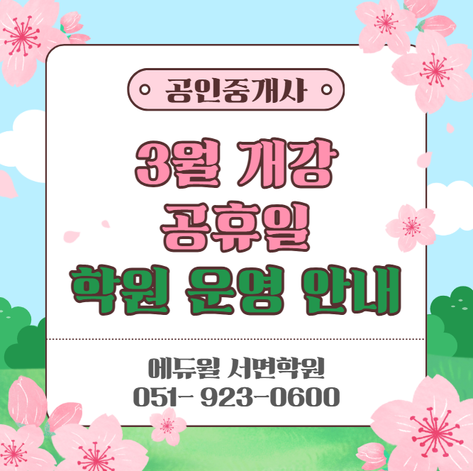 안녕하세요 : ) 부산공인중개사학원 #양산공인중개사학원 #밀양공인중개사학원 #고성공인중개사학원 #창원공인중개사학원 #경남공인중개사학원 에듀윌 공인중개사 서면학원입니다. 3월 공휴일 및 학원 운영 일정, 개강 안내드립니다. (↑ 클릭 시 다운로드) 주요일정 ✅ 3/2(월) 대체공휴일 부동산학개론 - 주간반 10:00~14:00 - 야간반 15:00~17:30 ※ 학원 운영 09:00~18:00 ✅ 3/23(월) 핵심이론 & 기출문제 개강(10주 과정) [주간반 10:00 ~ 14:00] 에듀윌 공인중개사 서면학원에서 2026년 공인중개사 시험 대비 핵심이론 + 기출문제 과정이 3월 23일(월) 개강합니다! 공인중개사 시험은 방대한 이론과 반복되는 출제 패턴을 정확히....... <img src="https://blogthumb.pstatic.net/MjAyNjAyMjZfNzEg/MDAxNzcyMDkzNjY5NDIw.I5f7ow17_FjQuZi-ezimcjHIhVt-BhpobQYphf6F9kog.hj2oj0t86vrHGrjIkATz3Ks8STZsdgD4gl-f3g2R7N0g.PNG/image.png?type=s3" />