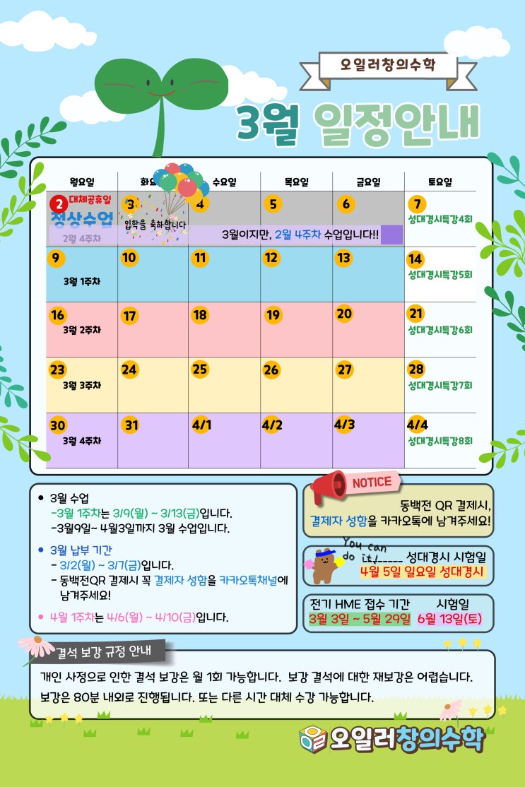 [오일러창의수학학원 : 대연동수학학원] 3월 수업일정 안내