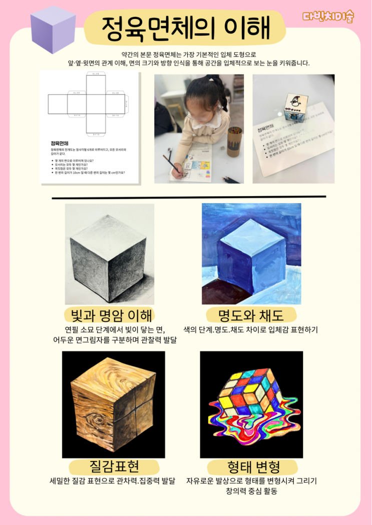 정육면체 이해로 시작하는 미술 수업 이야기 미술 수업에서 정육면체를 그린다고 하면 “도형 수업 아닌가요?” 하고 묻는 분들도 계세요. 하지만 정육면체는 미술에서 정말 중요한 출발점이에요. 정육면체는 가장 단순한 입체이지만, 아이들이 형태를 이해하고, 관찰하고, 표현하는 힘을 기르기에 아주 좋은 도형이거든요. 정육면체, 왜 그릴까요? 정육면체는 • 모든 면이 같은 정사각형이고 • 어느 방향에서 봐도 구조가 일정한 입체예요. 그래서 아이들이 “어디가 앞면일까?” “빛은 어느 쪽에서 올까?” “왜 이 면은 더 어두워 보일까?” 이런 질문을 자연스럽게 하게 됩니다. 이 과정에서 아이들은 그냥 그리는 게 아니라 ‘생각하면서....... <img src="https://blogthumb.pstatic.net/MjAyNjAxMjZfMTUw/MDAxNzY5NDMzMDA4NDAw.TBiolCVPqKmtJmGoZtDDq6JF0z9ZMICpy4bBaqVILJcg.y56nnasS0gCXiQyShDbQbiDWz2vp8Bmaz2z9CvZ8b2Yg.PNG/9.png?type=s3" />