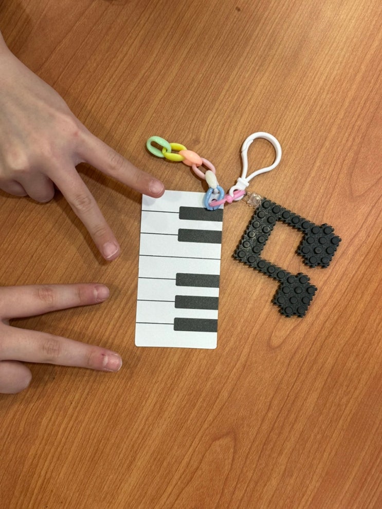 안녕하세요 칸타타 음악학원입니다 새학기를 맞아 어제는 이론수업 대신 조금 특별한 시간을 보냈어요 아이들에게 작은 선물을 준비했거든요. 바로 음표 네임택 키링 블록으로 하나하나 조립해서 직접 완성하는 키링이에요. (소근육 발달에 도움을 줍니다) 피아노는 실력도 물론 중요하지만 저는 아이들이 학원을 좋아하는 공간, 오고싶은 공간으로 기억했으면 좋겠어요. 신학기에는 설렘도 있지만 긴장도 많잖아요. 그래서 우리 학원에 오는 게 조금 더 즐거웠으면, 편하게 올 수 있었으면~ 하는 마음으로 작은 이벤트를 준비했답니다 완성되자마자 가방에 바로 달아보는 아이들, 엄마 보여주고 싶다고 예쁘게 다시 포장하는 아이....... <img src="https://blogthumb.pstatic.net/MjAyNjAzMDRfMjE0/MDAxNzcyNTg3OTgzOTY1.wiN0t7bdYp53bXGeNw644EjZWCfFOYnz0ymKxJyB8Xgg.LslntwX2kaJ0iILKLJajV1JNg2vRmeQCDqjlIB0pnDQg.JPEG/IMG%A3%DF8562.jpg?type=s3" />
