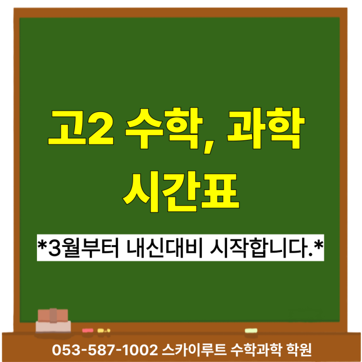안녕하세요.^^ 대학 잘 보내는 학원 스카이루트 수학과학 학원입니다.☺ 다사과학학원 *3월부터 내신대비 시작합니다.* 고2 수학 시간표 -고2 학생은 레벨 테스트가 없습니다. 학교 등급으로 반 배정이 이루어집니다. 대면 상담 필수 (약 1시간 소요) -결석 시, 결석분에 해당하는 수업 동영상을 제공하고 있습니다. 수학 등록 문의 : 053-587-1002 [교육비] 대수 수강료 : 220,000원 미적1 수강료 : 220,000원 확통 수강료 : 220,000원 *3월부터 내신대비 시작합니다.* 고2 물·화·생·지 시간표 -반의 레벨별 차이가 없으므로, 전화 상으로 바로 등록이 가능합니다. -결석 시, 결석분에 해당하는 수업 동영상을 제공하고 있습니다. 물화생지 등록....... <img src="https://blogthumb.pstatic.net/MjAyNjAzMDZfNDMg/MDAxNzcyNzg3Mjk2MzE1.1dhga9OBcp97jRQ6HtNIXVPGKA9PP1oO_bxQ9QlAN4sg.A0FDsh5zDh6Dfh0ESMCQaLML-X-Qlxiy6WJ6FRgDpKsg.PNG/%B4%D9%BB%E7%B0%FA%C7%D0%C7%D0%BF%F8_%B0%ED2_%BC%F6%C7%D0.%B0%FA%C7%D0_%BD%C3%B0%A3%C7%A5.png?type=s3" />