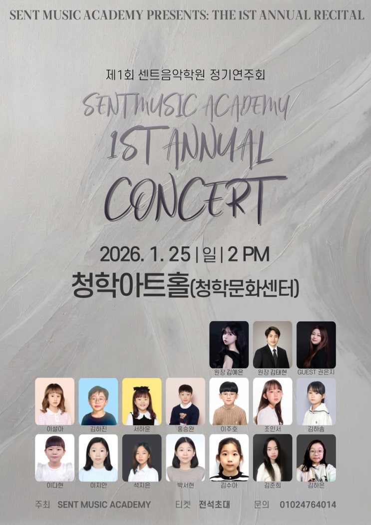 안녕하세요 :) 센트음악학원입니다^^ 저희 학원 첫 정기연주회 포스터가 완성되었어요! 어떤가요?! 우리 아이들 너무 멋있죠❤️❤️ 아이들과 하나하나 준비해온 시간이 이제 하나의 무대로 이어지게 되었어요ㅎㅎㅎ 이번 연주회는 단순히 “연주를 잘했는지”보다 아이 한 명 한 명이 무대에 서는 경험 자체가 좋은 기억으로 남는 시간이 되었으면 하는 바람으로 열심히 준비하고 있어요 :) 무대 위에서 떨기도 하고, 실수도 하고, 그럼에도 끝까지 연주해내는 경험이 아이들에게 분명 오래 남을 거라고 생각해요❤️ 포스터도 학원에서 직접 제작하면서 아이들 얼굴 하나하나 떠올리며 준비했습니다 이 무대가 아이들에게는 작은 성취....... <img src="https://blogthumb.pstatic.net/MjAyNTEyMTBfMTA2/MDAxNzY1Mjk5MTk2OTQ4.u87YTVVJ1Gil69Ei08Lviy4L8FUS1Esn0dqp9pqcalEg.VBpx6wlWCAcWXu3oFTBEvDh1ZCEdcK8t58ZKMyuVDXIg.JPEG/IMG%A3%DF4852.JPG?type=s3" />