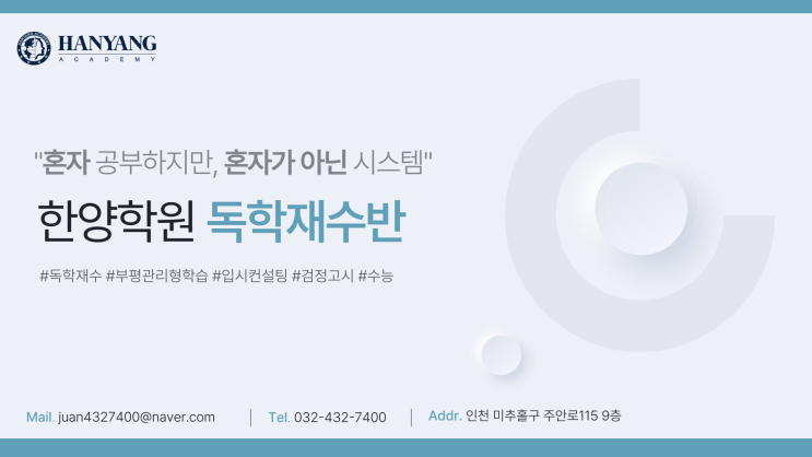 “공부는 혼자이지만, 입시는 함께 가겠습니다.” 안녕하세요, 한양학원 주안점입니다. 올해도 어느덧 마지막 페이지를 향해 가고 있습니다. 학생 한 명 한 명의 노력을 가장 가까이에서 지켜봐온 만큼, 학부모님들께도 이 시기가 얼마나 고민이 많은 시간인지 잘 알고 있습니다. 오늘은 2027학년도 입시 준비를 위한 ‘독학재수반’ 안내를 전해드립니다. 새로운 도전을 앞두고 계신 학생들과 학부모님께 조금이나마 방향을 드리고자 정성껏 준비한 프로그램입니다. 독학재수반은 단순한 자습형 프로그램이 아닙니다. 입시전략 · 수시전략 · 정시전략이 하나로 연결되는 “전략 기반의 학습 시스템”으로 운영됩니다. 결국, 합격을 만드는....... <img src="https://blogthumb.pstatic.net/MjAyNTEyMTJfNDIg/MDAxNzY1NTExMTIyNTk0.r2UmK2rwQtdtJsB0KupA_GKSwWxnilxFcSOaCFlOGw8g.ZulMlQrrcO4QqSKL7KsaTZaaFOgvsrW0C7lN42TuxAEg.PNG/001.png?type=s3" />