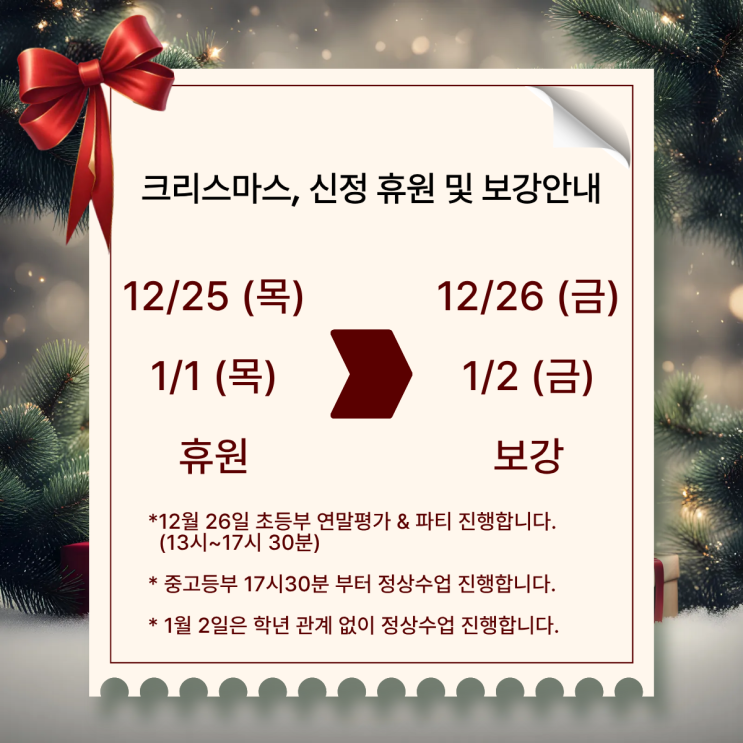 안녕하세요. IGSE주안학원입니다. 12월 25일, 1월 1일 휴원 및 12월 26일, 1월 2일 보강 일정 안내드립니다. *26일에는 초등부 연말 평가 및 크리스마스 파티 진행됩니다. (중고등부는 17시 30분 이후 정상수업 진행됩니다.) #구월서초영어학원 #구월서초학원 #구월서초수학학원 #상인천여중영어학원 #상인천여중수학학원 #상인천여중학원 #동인천중수학학원 #동인천중영어학원 #동인천중학원 #인천고영어학원 #인천고학원 #인고영어학원 <img src="https://blogthumb.pstatic.net/MjAyNTEyMTZfMTY4/MDAxNzY1ODU4Mjc1NTgy.UdFMia_et958UQ34ZiFjDSRiZ4TVu9AEu2KPiFZYl3Yg.FWFrZMX9nJ1ku2GJnMMuEkZSQVImojH8qSicVo6TOjYg.PNG/%C1%A6%B8%F1%C0%BB_%C0%D4%B7%C2%C7%D8%C1%D6%BC%BC%BF%E4._%283%29.png?type=s3" />