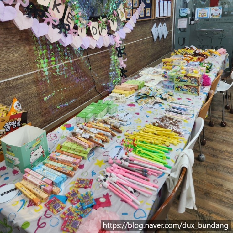 안녕하세요. 분당 덕스어학원입니다. 학기를 마무리 하는 행사로 지난 3일간 스탬프 마켓데이를 진행했습니다! 우리 학생들은 한 학기 동안 열심히 모은 스탬프를 모두 예쁜 선물로 교환했답니다. 돌아오는 3월 학기에도 열심히 스탬프를 모아서 많이 바꿔가기 바랍니다~ <img src="https://blogthumb.pstatic.net/MjAyNjAzMDNfMjM3/MDAxNzcyNTM1NzEzMzk1.ThMR-FrT-vkgRNEU6REKExM3HgR9oa6d-Gm73QNDd4Ig.hLu-kBPWwiZOvzc4BTsGFVV4y0ziZxd6o-zmEV1aynkg.JPEG/KakaoTalk_20260303_200013918.jpg?type=s3" />