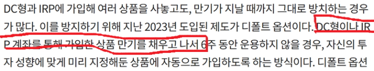알아서 굴려주는 ‘디폴트 옵션’ 가입하면 노후가 든든 남편이 잠시 다닌 벤처기업에서 나온 퇴직연금을 '디폴트 옵션'에 가입했다. 그래서 이번 장에 돈 좀 벌었겠거니 생각하고 오랜만에 수익률을 확인했는데, 이런!!! 그냥 현금성 자산의 기본 수익률.T,T 알고 보니 디폴트 옵션은 조건이 있다. 위 기사대로 '가입한 상품 만기를 채우고 나서'다. 남편은 이걸 만들 때 "어떤 상품에 가입할 지는 다음에 생각할게요"라고 말했던 것. 이제야 이 구절이 보인다. 지나간 시간과 수익률이 아깝지만, 자본시장 역시 단어 하나, 조건 하나도 놓치면 안된다는 교훈을 얻은 데 의의를 둔다. 흠. 디폴트옵션은 됐고. 너....... <img src="https://blogthumb.pstatic.net/MjAyNjAyMjdfOTEg/MDAxNzcyMTY2MzQ2NTAx.OVbkFbwgWQnLmrW54Ld12oNe4hLx5eYg8LW1KhEjJlsg.Dn3XUjRLWHZ38kyOiQVsEFvW8b-JxOcYMqYa1_jw2mUg.PNG/%B5%F0%C6%FA%C6%AE%BF%C9%BC%C7.png?type=s3" />