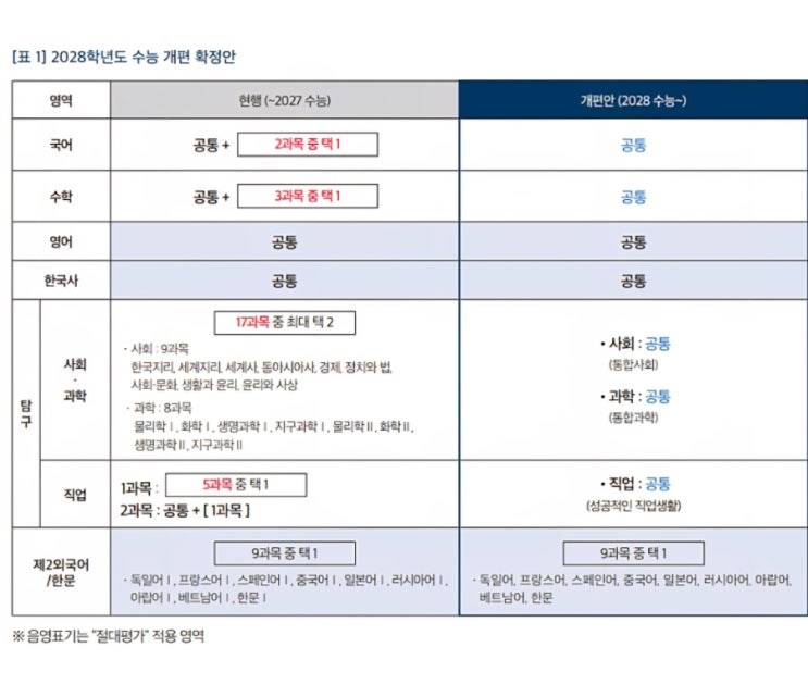 2028 대학입시제도 개편 핵심 정리 교육부 발표 기준으로 2028학년도 대입부터 수능이 선택과목 없는 통합형으로 전면 개편됩니다. 이번 개편은 「고등교육법」에 따른 대입 4년 예고제를 근거로 하며, 현재 중학교 3학년 학생들이 대학에 진학할 때 최초 적용됩니다. 2025·2026·2027학년도 수능은 현행 제도가 그대로 유지됩니다. 국어와 수학은 기존 선택과목 제도가 폐지되고 전원 공통 시험으로 운영됩니다. 영어와 한국사는 현행처럼 공통 과목으로 유지됩니다. 사회와 과학은 선택형 탐구가 사라지고 통합사회, 통합과학으로 단일화됩니다. 직업탐구 역시 공통 과목인 ‘성공적인 직업생활’로 통합됩니다. 제2외국어/한문은 기존과 동일하....... <img src="https://blogthumb.pstatic.net/MjAyNjAyMTBfMjU3/MDAxNzcwNjUyMTA4Nzg4.de7SNpWE-Mg5DracUsejVuYoUmrxRsexAGCDRwbUv3Qg.fydiW8VsbaFl4XEMLtsJ5kA-UiuwdCNZvP9B4n2KKUgg.JPEG/900%A3%DFScreenshot%A3%DF20260210%A3%DF004306%A3%DFNaver_Cafe.jpg?type=s3" />