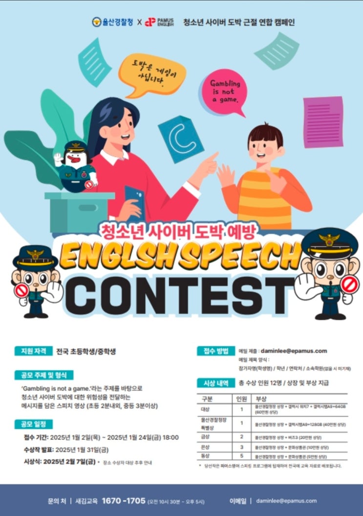 울산경찰청 영어 스피치 공모전 동상 수상! 파머스어학원 남목캠퍼스 학생, 또 한 번 해냈습니다✨ 파머스어학원 남목캠퍼스에서 기쁜 소식을 전합니다! 저희 학원 학생 진0준 학생이 울산경찰청과 새김교육이 공동 주관한 **「청소년 사이버 도박 예방 영어 스피치 공모전」**에서 동상을 수상했습니다! 이번 대회는 단순히 영어 실력뿐 아니라 논리적 사고력, 사회적 메시지 전달력, 그리고 올바른 디지털 시민성을 평가하는 중요한 공모전이었습니다. 0준이는 평소 학원에서 갈고닦은 스피킹 실력과 자신감, 그리고 꾸준한 연습을 바탕으로 심사위원들에게 명확한 발음, 자연스러운 어휘 선택, 전달력 있는 스피치를 인정받아 수상의....... <img src="https://blogthumb.pstatic.net/MjAyNTExMjVfMjkx/MDAxNzY0MDUyNjY2NTYy.eTVAzNozIenZSXjPZgNjXJu2Ok6y0yren1oLkQgmUcog.HpUeiJpciU5PAHY_11RTdV7-kLV-Yyut2YKq4gGXa6Ug.JPEG/KakaoTalk_20251125_153633789.jpg?type=s3" />