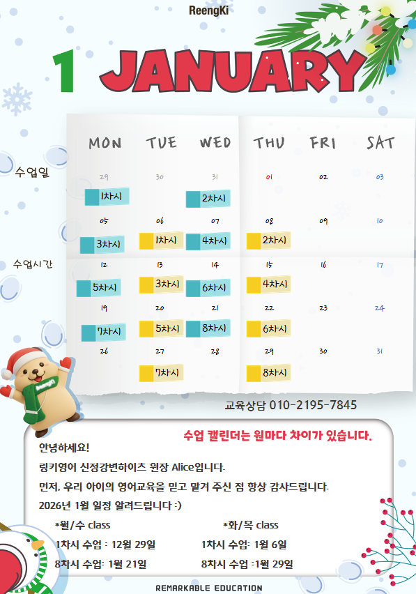 안녕하세요:) 링키영어 신정강변하이츠 원장 Alice입니다 :) 2026년 1월 수업일정 안내드리겠습니다. 2026년 1월 수업일정 안내 수업교재 안내 stage 1-1 Stage 1-2 Stage 2-1 Stage 2-2 JUICE 1월 과정 링키영어 수업이 궁금하신가요? 체험 수업 신청받고 있습니다 ↓↓↓↓↓↓↓↓↓↓↓↓↓↓↓↓↓↓↓ 네이버 폼을 통해 신청서를 작성해주셔야 체험 수업 신청완료됩니다 ^^ 문의 사항은 네이버 톡톡 또는 상담전화 주시면 친절히 안내해 드립니다 <img src="https://blogthumb.pstatic.net/MjAyNTEyMTZfMjM0/MDAxNzY1ODY0MjAwNzQx.EGjDuEujYq5KONjPVine5LJ7JmWsjXTBzvVLaY6ZuM8g.QR140qDSHSZ-Gm4oZONwq8zSbJg6-itk0f7VdERpwvEg.PNG/%BD%BA%C5%A9%B8%B0%BC%A6_2025-12-16_141517.png?type=s3" />