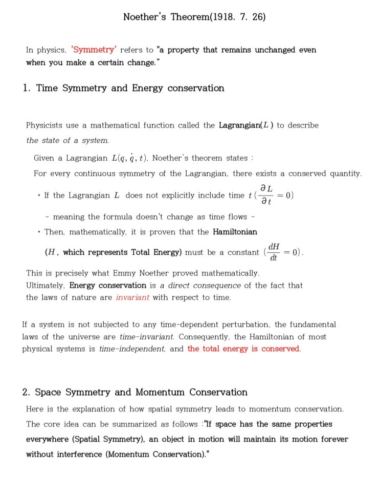 양자역학 이해를위한 대칭성은 보존을 의미한다는 20세기초 위대한 수학자 에미 뇌터의 정리 입니다. <img src="https://blogthumb.pstatic.net/MjAyNTExMjFfMTM1/MDAxNzYzNjkyODYxMzc0.Qg8SGcZZvVgls20gfvW4TxOmrRLdTB7lUM3djpJbyUUg.m-tg_RAjbEc7mOoStEvfrQoRpC2cIAffRTlO6zh5Pcog.JPEG/Screenshot%A3%DF20251121%A3%DF111448%A3%DFHancom_Office_Viewer.jpg?type=s3" />