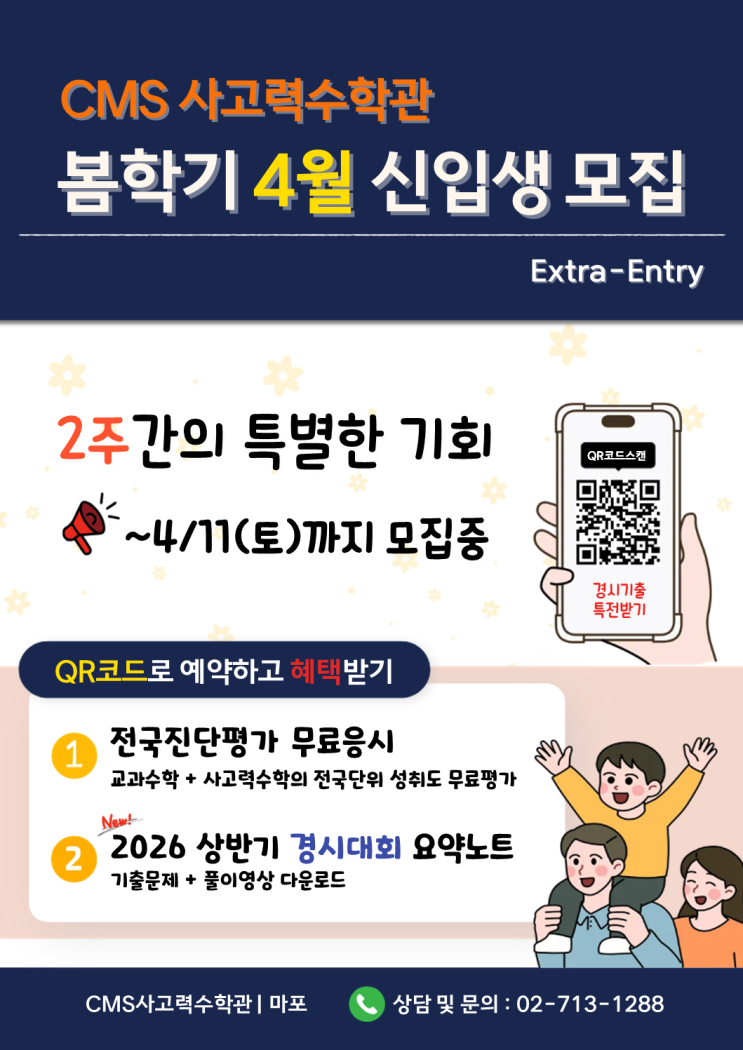 사고력의 깊이가 성적의 높이! CMS 마포 사고력수학관입니다. 봄학기 3월 개강을 놓치신 분들의 위해 4월 부터 수강할 수 있는 추가 입학 기회를 드립니다. 2주간의 특별한 기회! 3월30일(월), 2차 개강을 놓지치 마세요.^^ ■ 혜택 1 : 무료 입학테스트 ■ 혜택 2 : 경시대회 오답노트 증정 ★아래 안내문 이미지를 클릭하시면 입학테스트 예약 페이지로 이동합니다.★ ■ 문의 ■ *전화 : 02-713-1288 *카카오톡 채널 : http://pf.kakao.com/_xexcZBG [서울서부교육지원 등록] 씨엠에스학원 제02201200067호 마포씨엠에스학원 제02201700028호 CMS마포영재교육센터 수강료는 [블로그-CMS마포영재교육센터-교습비게시표]에서 확인하실 수 있습니....... <img src="https://blogthumb.pstatic.net/MjAyNjAzMThfMTEy/MDAxNzczODMyNTQxNDc4.wQL3_tCsuyGuDtFaGiPsNUYZydp0BBJtwvUj8e2NOCQg.ok_i6y3-WtxhwvMICMfpXPJOoupe9VXN_SDvIVvxtFMg.PNG/%BD%BD%B6%F3%C0%CC%B5%E51.PNG?type=s3" />