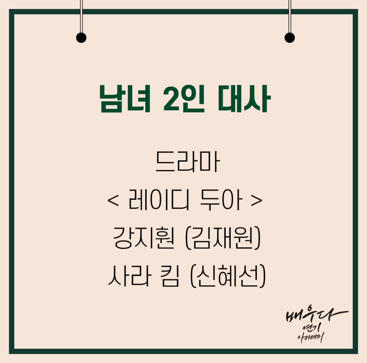 드라마 < 레이디 두아 > 4화 강지훤 (김재원), 사라 킴 (신혜선) 남녀 2인 대사 강지훤 : 이야… 집 좋다. 돈이 좋은 건가? 사라 킴 : 마음에 든다니까 다행이다. (카드를 건네며) 받아, 선물. 강지훤 : 응? (카드를 확인하고) 응, 자주 올게. 사라 킴 : 키 말고 집. 여기 네 명의로 계약했어. 강지훤 : 뭐? 뭘? 사라 킴 : 새출발하자, 우리. 과거는 다 잊고. 여기는 일조량이 많아서 알람도 필요 없대. 이제 남들처럼 밤에 자고 아침에 눈 뜨는 거야. 강지훤 : … 사라 킴 : 왜 아무 말이 없어? 강지훤 : 그… 어, 잠깐만. 그때 그 차 키 말이야 내가 훔쳤어. 사라 킴 : 알아. 강지훤 : 아, 알고 있었어? 그 좋은 옥스퍼드에서는 남자 조....... <img src="https://blogthumb.pstatic.net/MjAyNjAzMThfMjcx/MDAxNzczODA2NTAxMzEx.T1hTCzLAupNjBDqHmVG2sH6M_Xh1B6chIVH5BigDBeUg.XFP3xhnDkFrVQ5pGSNuWUWO3wesWS7MTsPer70RIyy4g.PNG/%B7%B91.png?type=s3" />