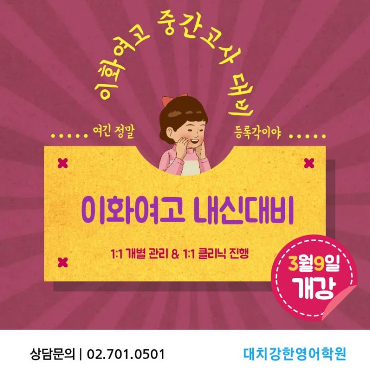 이화여고 1학년 중간고사 시험 대비 교과서 : 천재 부교재 : 올림포스 전국연합 이화여고는 영어가 어렵고 까다롭습니다. 대치강한영어학원은 1:1 관리 및 지도로 모든 학생들이 좋은 점수를 받을 수 있게 최선을 다하고 있습니다. 이화여고 내신 정규 수업 시간 월요일 5시 ~ 8시 수요일 7시 ~ 10시 1:1 클리닉 시간 : 학생과 상의 꼼꼼하고, 학생 개인에 맞는 1:1 클리닉 관리 및 수업으로 진행 됩니다. 초, 중, 고 영어전문 학원 대치강한영어학원 02.701.0501 <img src="https://blogthumb.pstatic.net/MjAyNjAzMThfMjky/MDAxNzczODQzNDg0NTY2.sPAEKIhncv6aES1uTkX0kQKuN8Vi5irJYHuW8X2aebEg.ZhxIAnnKqzdF9HeVKKlbMDYhCgIhVd5GI1wFc4W5lbEg.JPEG/%C0%CC%C8%AD%BF%A9%B0%ED.jpg?type=s3" />