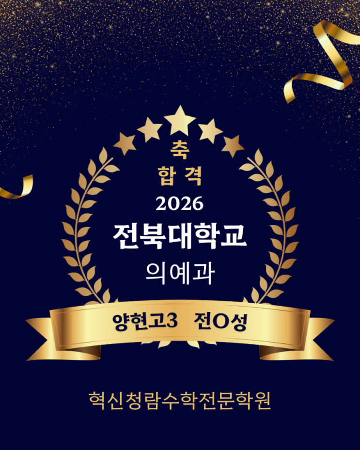 중3부터 청람을 다니며 열심히 공부했던 우리 학생이 전북대 의대 합격했습니다 수능 96점 월등한 실력으로 가볍게 최저를 맞추고 합격했습니다 훌륭한 실력과 겸손한 성품으로 훌륭한 의사선생님이 될거라 믿어 의심치 않습니다 축하합니다^^ <img src="https://blogthumb.pstatic.net/MjAyNTEyMTZfMjM1/MDAxNzY1ODEyMjkzMzk3.9fy6YNOQz7d9A866aTUToNFVSwMbJrIdeCqQEsmSsoUg.htUvqob97YSgeY_X7Gsd6pJCXXmbMPC2bClqzZhpfLAg.PNG/900%A3%DF1765812019342.png?type=s3" />