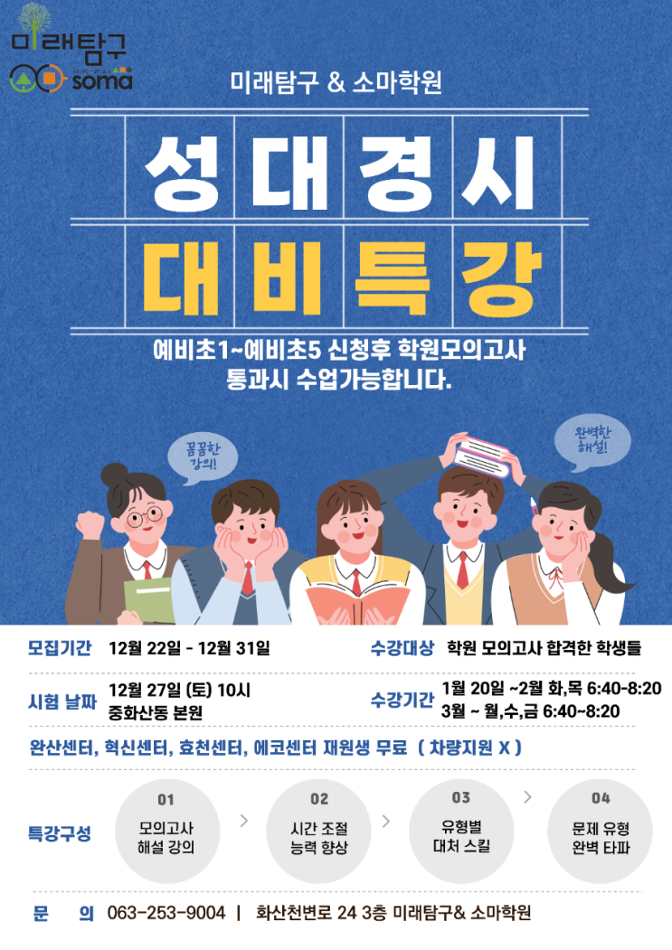 안녕하세요 미래탐구수학혁신학원입니다 2026 전기 성대경시 대비 특강이 미래탐구 중화산 본원(완산센터)에서 개강합니다. 특강신청 시 학원모의고사를 합격한 학생에 한해 수강가능하며 미래탐구 완산, 혁신, 효천, 에코센터 재원생은 무료로 진행됩니다. 관심있는 학생들은 원으로 문의주세요! 미래탐구수학혁신학원 소중한 우리 아이 더 특별하게 상담 및 수강 문의 ☎️063.228.9004 인스타 @miraetamgu_math_hs 위치 완주군 이서면 출판로 46-4 영동 빌딩 6층 #전주 #전주혁신도시 #전주혁신 #만성동 #혁신동 #이서면 #전주수학학원 #전주혁신도시수학학원 #전주혁신수학학원 #만성동수학학원 #혁신동수학학원 #이서수학학....... <img src="https://blogthumb.pstatic.net/MjAyNTEyMTdfNzcg/MDAxNzY1OTUxNzg4NDk5.QKi-r_h0aUaxEhkL68L0n0Tqf7xca-U7_arJIfzVu6gg.wRATo0iqBzKmayiSsv7U9yTxOuRm7GE6yZnlGy9aQOYg.PNG/900%A3%DF1765883438812.png?type=s3" />